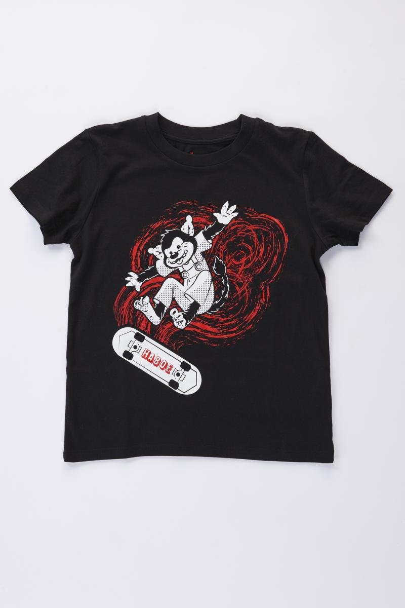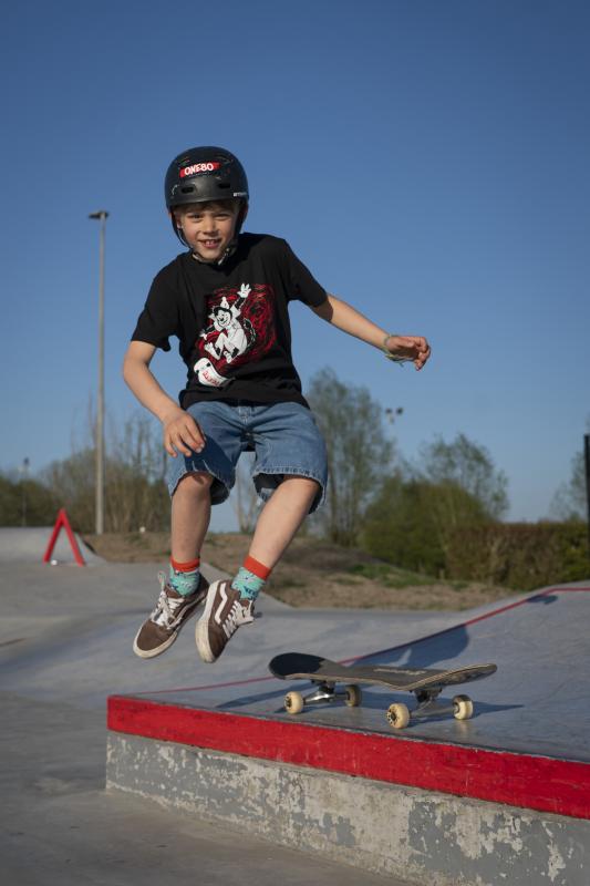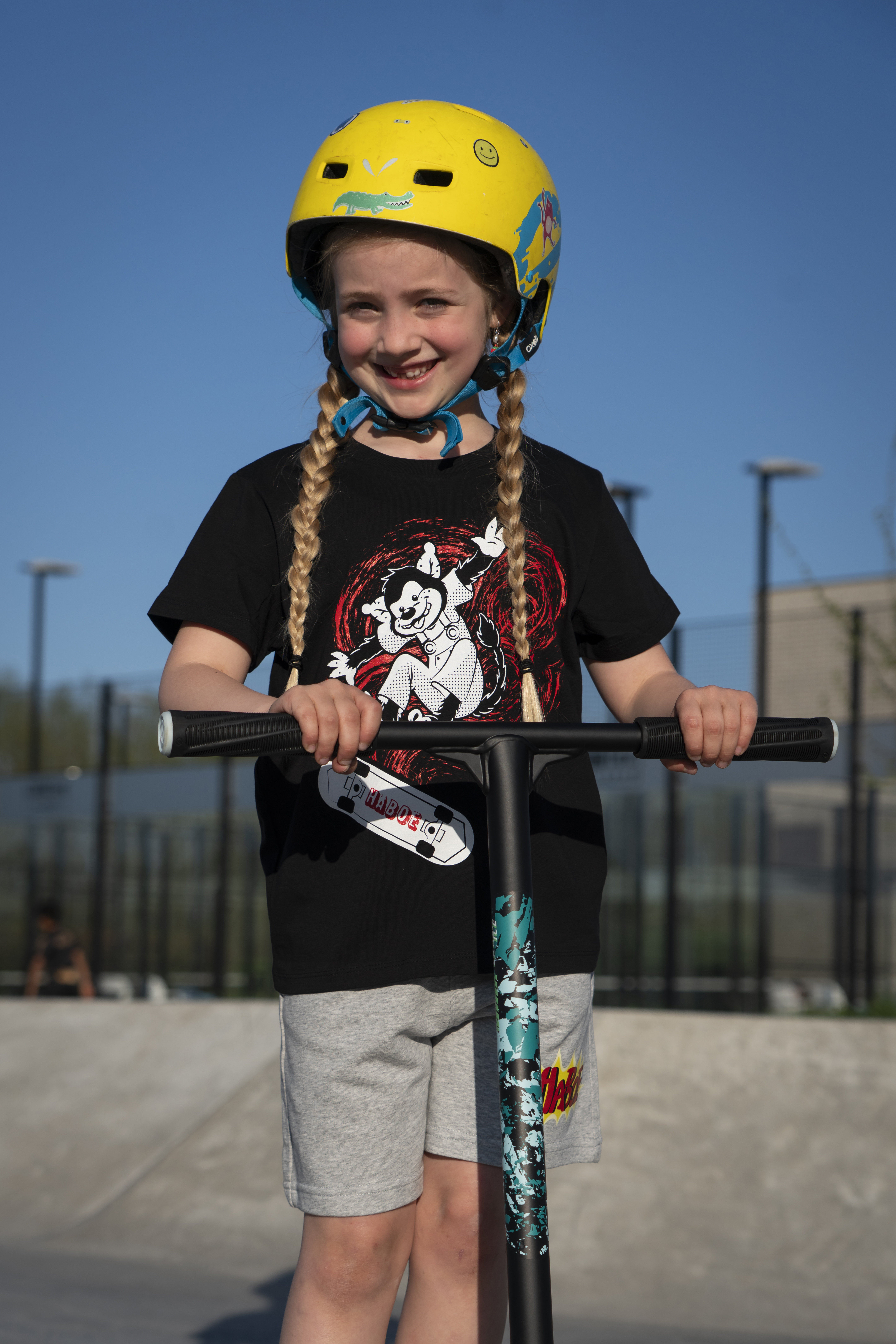 Combinatie van het boek 'De spelen van het Biezebos' met de t-shirt 'Skating Piepel'.